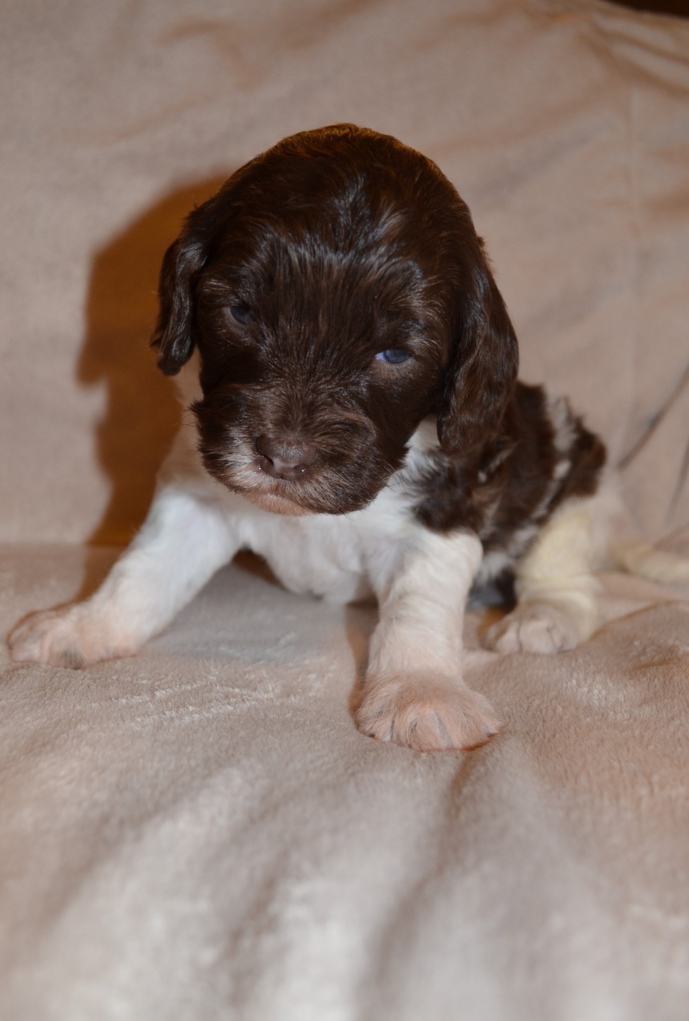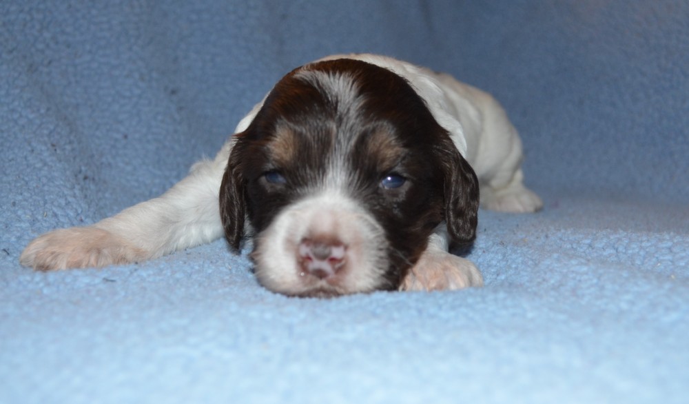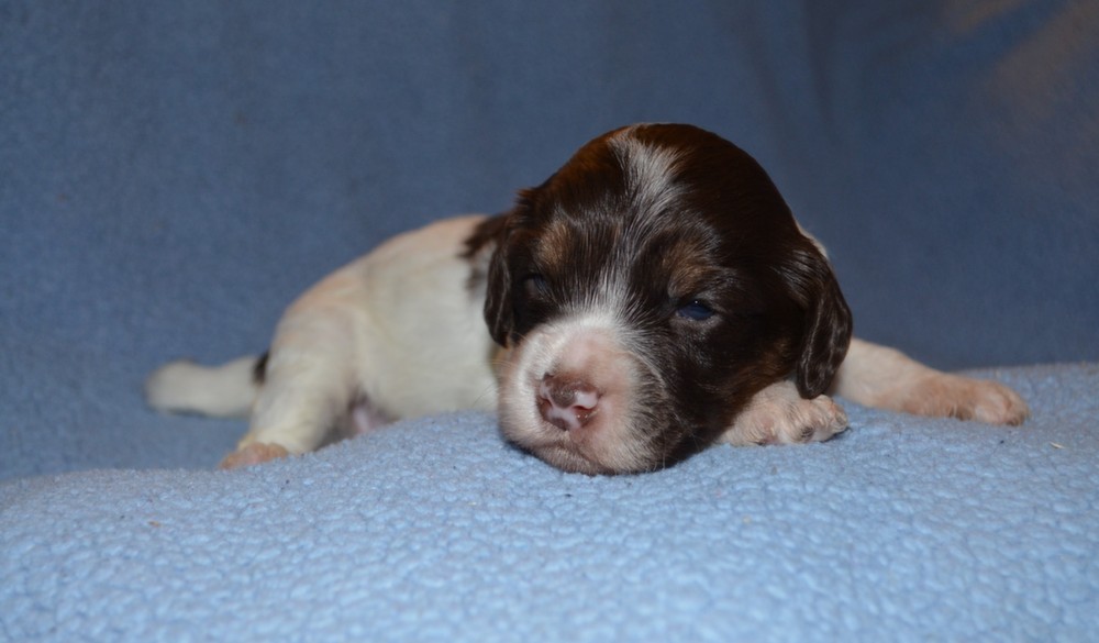 All of puppies now have both their ears and eyes open. They are starting to stumble around and explore their surroundings. The pigment on their spotty noses is also filling in nicely.