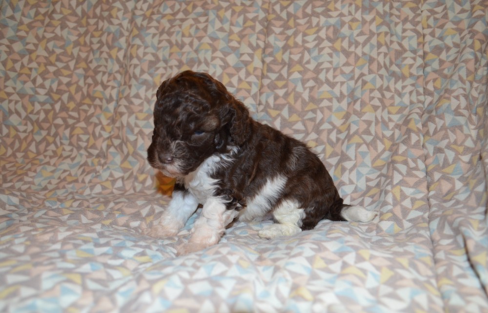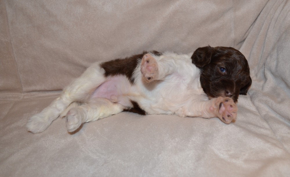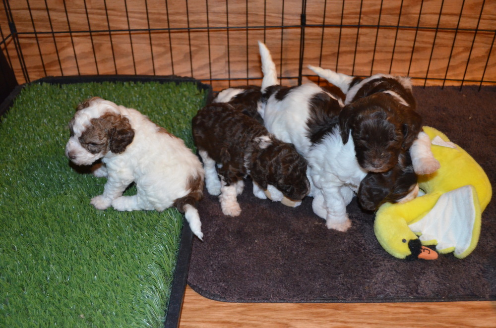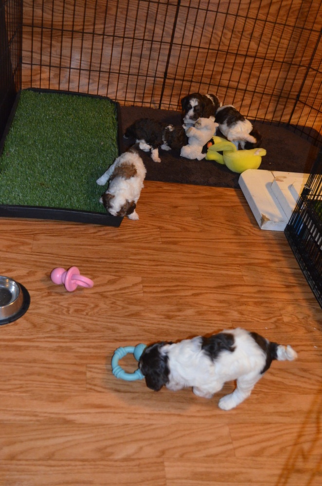 The puppies all received their first bath, blow-dry and nail trim today. We like to introduce them to the hairdryer and grooming at a young age to help prepare them for when they go to the groomers. The puppies are now able to walk around (quite clumsily but progressing well). They have progressed out of their whelping box to their play pen which they are enjoying. They are having fun and starting to wrestle with each other. We have started potty train them all to go on an artificial turf mat. This will ease the transition for both the puppy and for you for when your puppy comes to your home.