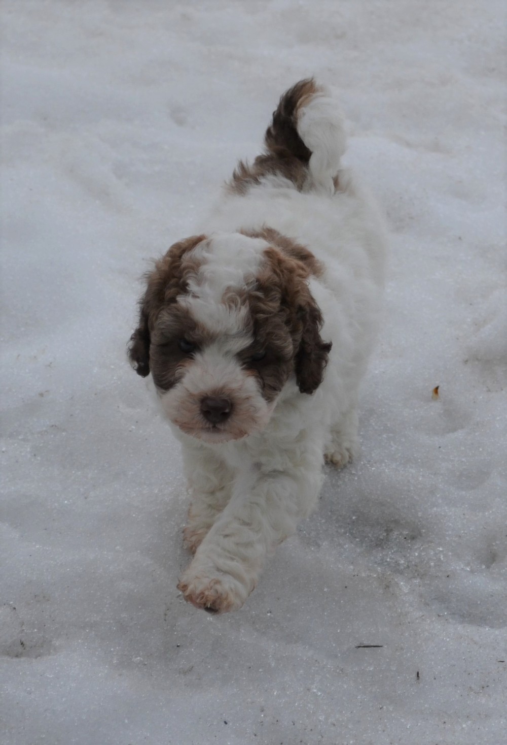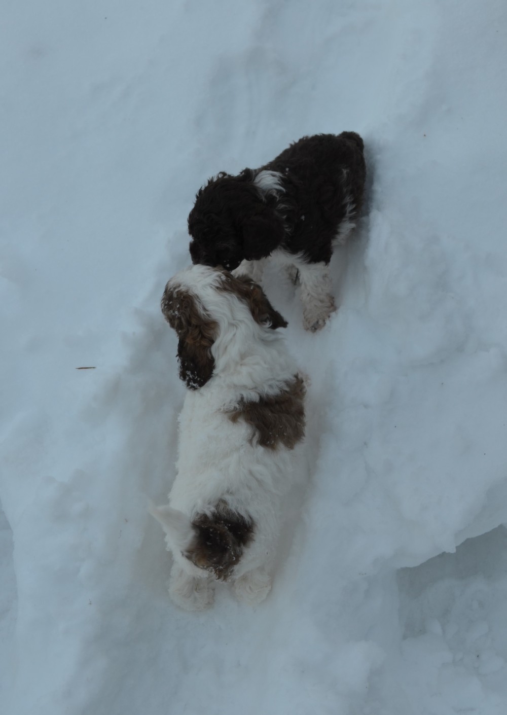 These sure are a smart litter of puppies. They are about 90-95% potty trained to go onto an artificial turf mat that is in their play area. All of the puppies are teething so they love to chew on their toys and chew sticks and play tug of war with each other. The puppies are also crate training which is going well. Enjoy the snowy photos!
